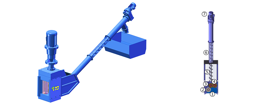 • 5.粉碎后的細(xì)小固體顆粒被導(dǎo)入斜立的螺旋輸送機(jī)